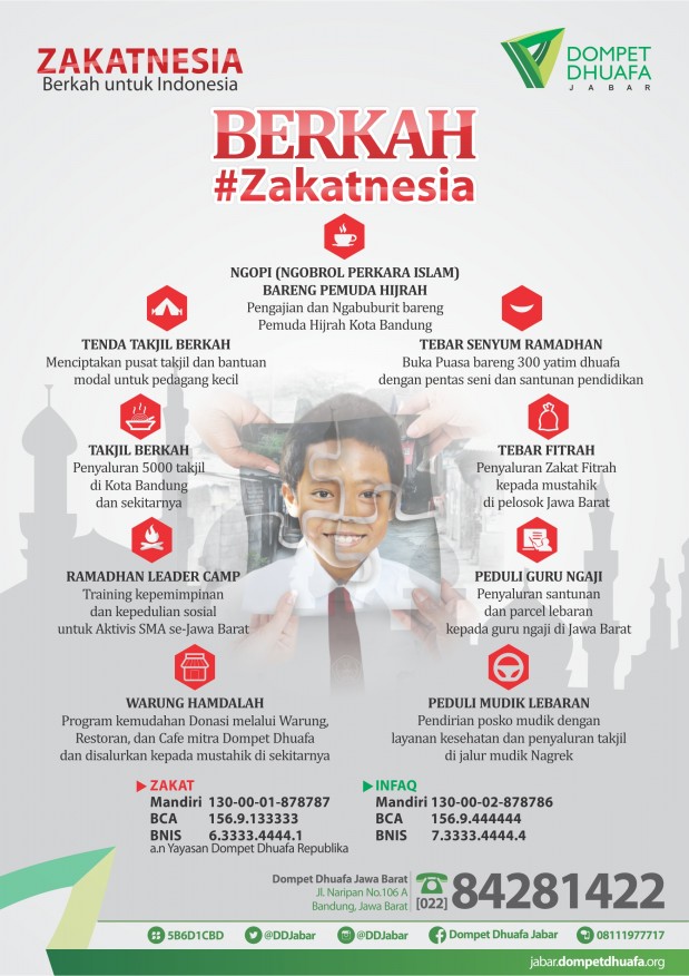 Pada momentum Ramadhan 1437 H kali ini, dengan semangat Zakatnesia, Dompet Dhuafa Jawa Barat mengadakan program dan event di bidang pendidikan, ekonomi, kesehatan, dan sosial dakwah. Program dan event Ramadhan yang dilaksanakan juga diharapkan dapat menghadirkan kebahagiaan bagi masyarakat mustahik penerima manfaat program. Diharapkan ada lebih dari 10.000 masyarakat yang terbantu selama momentum Ramadhan 2016 ini.