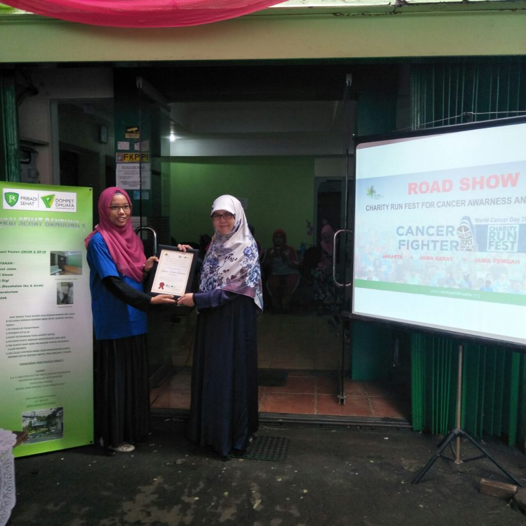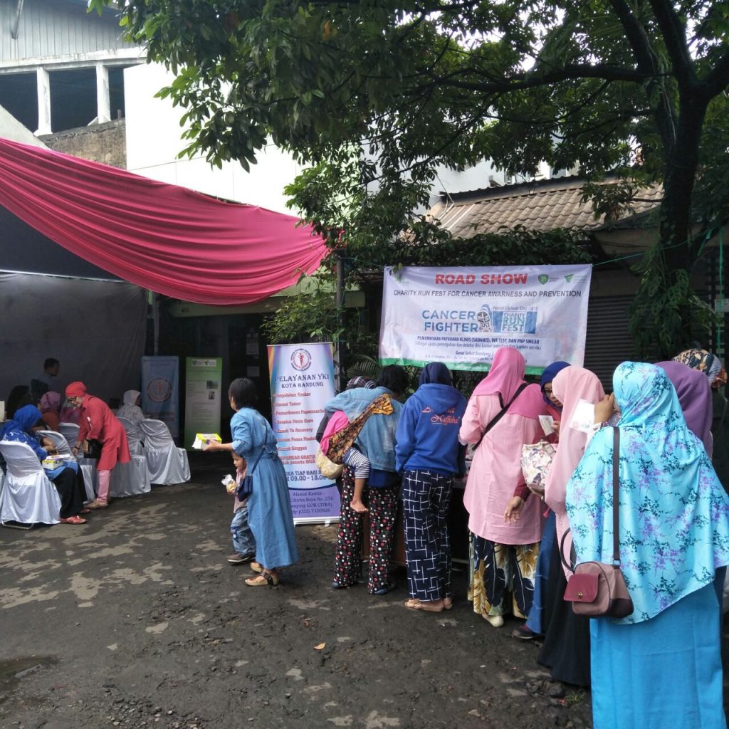 Dalam rangkaian kegiatan World Cancer Day 2018 yang jatuh pada tanggal 4 Februari 2018, Dompet Dhuafa mengadakan Roadshow Charity Run Fest for Cancer Awareness and Prevention dan dilaksanakan di empat provinsi yaitu DKI Jakarta, Jawa Barat, Jawa Tengah, dan NTT. Bekerjasama dengan Yayasan Kanker Indonesia dan LKC Jabar, Gerai Sehat Bandung 1 dan Dompet Dhuafa Jabar mengadakan kegiatan penyuluhan dan pemeriksaan Sadanis ( Periksa Payudara Klinis) , IVA test dan Papsmear ( Deteksi Kanker Serviks) gratis untuk 100 peserta wanita usia produktif dari Kelurahan Pasir Impun dan sekitarnya bertempat di Gerai Sehat Bandung 1 Jalan AH Nasution KM 9 Sindangjaya Bandung pada Hari Jumat (9/3).