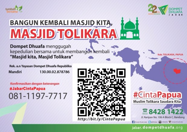 Mari kita semua bergerak untuk kembali menyala lentera membangun kehidupan di Tolikara agar kembali bangkit dalam perdamaian seperti sediakala. Dukungan dan cinta Anda terhadap Tolikara, Papua, dapat disalurkan melalui program Rehabilitasi Masjid Tolikara, di nomor rekening: Bank Mandiri 130.00.02.878786, atas nama Yayasan Dompet Dhuafa Republika. Karena donasi Anda begitu berharga untuk membangun kembali kehidupan saudara kita di Tolikara. (Dompet Dhuafa/Taufan YN)