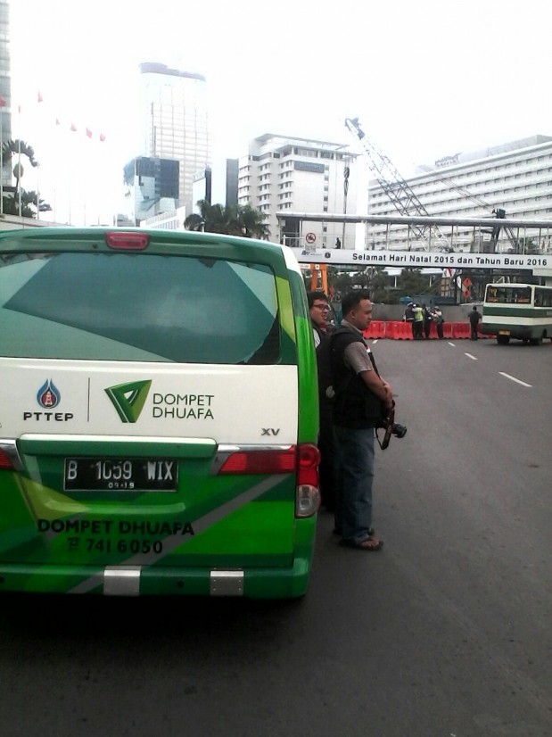 Berdasarkan laporan dokter Salim dari Layanan Kesehatan Cuma-Cuma (LKC) Dompet Dhuafa, saat ini ambulans bersiaga di bilangan bundaran HI. “Polisi menutup akses menuju Sarinah di bundaran HI. Ambulans LKC Dompet Dhuafa turut berjaga-jaga di sana,” ujar Salim di lokasi.